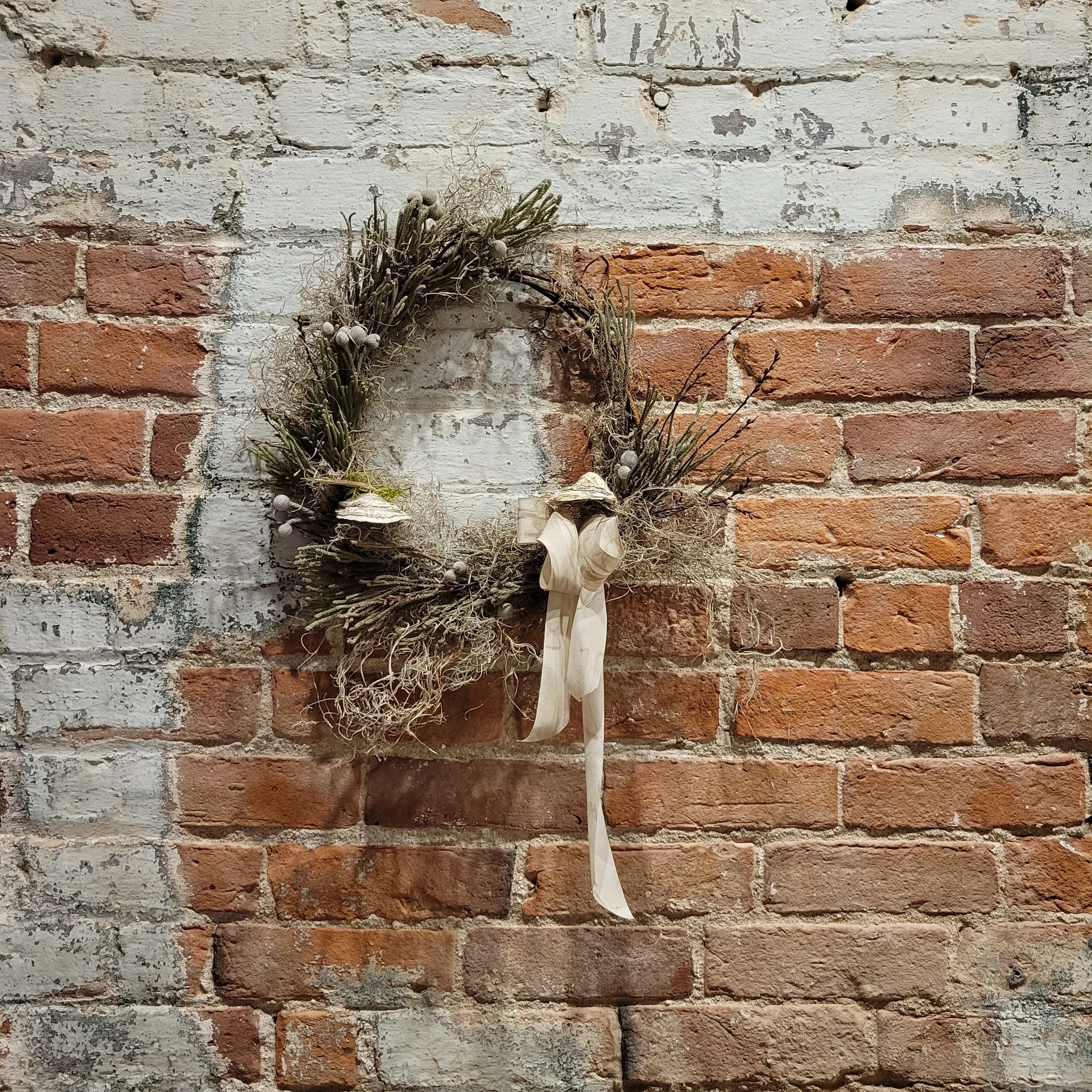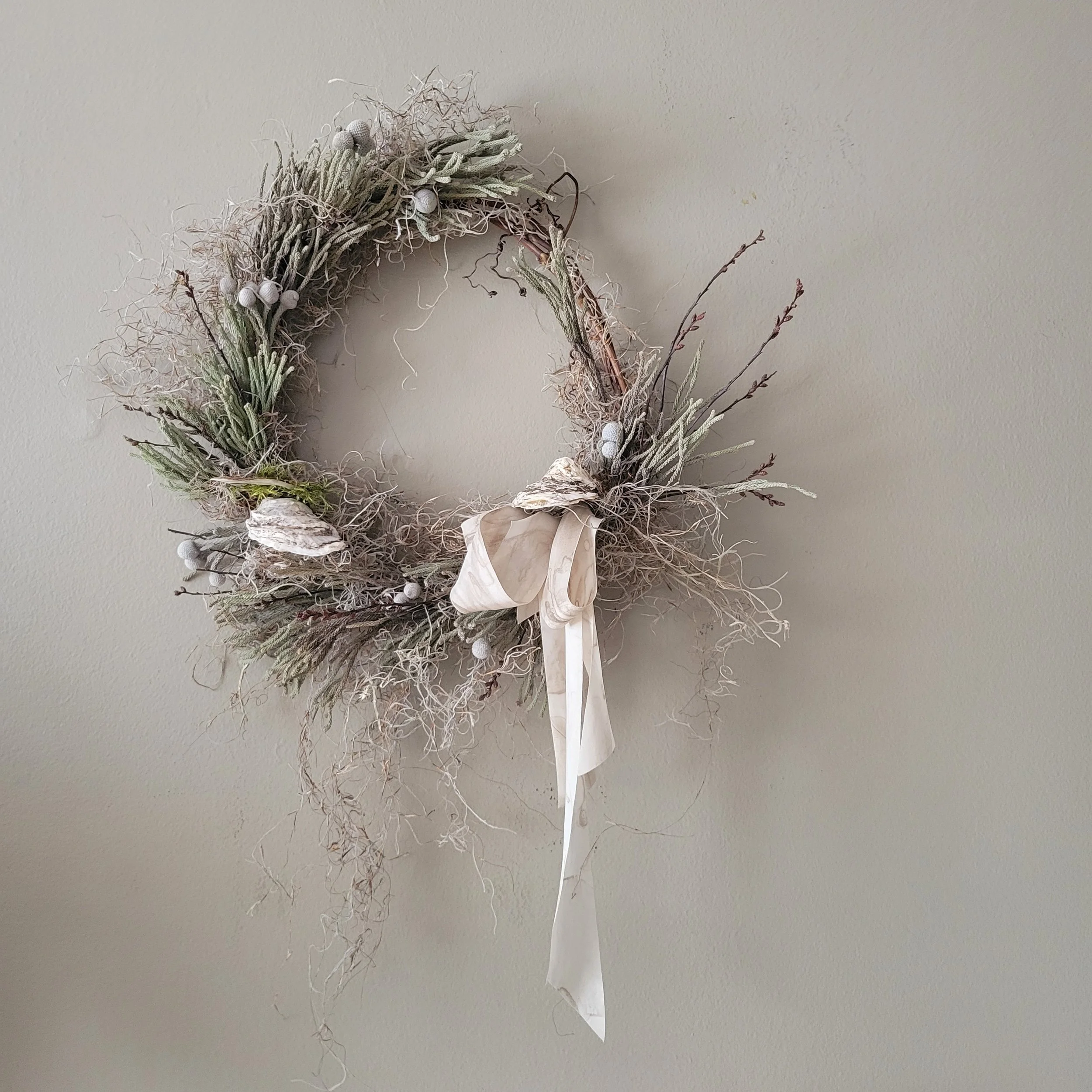 A mossy wreath that reminds me of the seaside and my family trips to the East Coast. The beautiful silver tones are a chic addition to your home decor and provide a elegant and unexpected contrast to seasonal evergreens. Each wreath includes P.E.I. oyster shells nestled into Spanish moss, seed pods, and brunia on a locally foraged and handmade grapevine wreath.